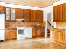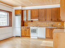 - Keittiön varusteet: Jääkaappipakastin, astianpesukone, liesituuletin ja uuni. Liesi: Sähköhella. Työtason materiaali: Laminaatti ja teräs. Keittiön kaapit: ruskeat
