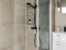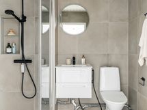 - Pesutilojen kuvaus: VARUSTUS: Sadesuihku, suihkuseinä, pyöreä valopeili, kylpyhuonekaapisto, syvennys hylly, bideesuihku, pesukoneliitäntä, pyyhekoukut, lattiamämmitys (sähkö).