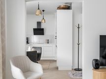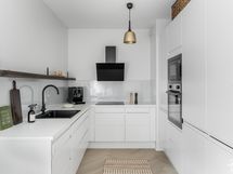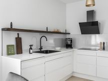 - VARUSTUS: Integroitu jääkaappi/pakastin, integroitu astianpesukone, induktioliesi, kiertoilmauuni pyrolyysitaoiminnolla, liesituuletin, kaapistot, avohylly.