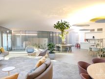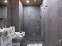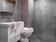 - Pesutilojen varusteet: Suihkuseinä, pesukoneliitäntä, allaskaappi, peilikaappi, lattialämmitys, wc-istuin, suihku, pesuallas ja bidee-suihku.