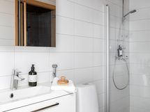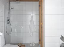 - Varustus: suihkuseinä, pesukoneliitäntä, lattialämmitys, wc-istuin, suihku, peilikaappi, kiinteät valaisimet, kylpyhuonekaapisto.