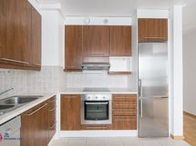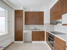 - Valoisassa keittiössä tila ruokailuryhmälle, astianpesukone, kalusteuuni (kiertoilma), keraaminen liesitaso, liesituuletin, jääpakastinkaappi, kaapistot, kiinteät valaisimet. Välitila sekä lattia laatoitettu, seinäpinnat maalattu.
