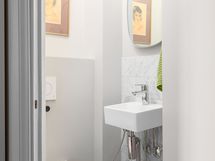 Säilytystilaa on hyvin allaskaapistossa sekä peilikaapissa. . Erillisen WC:n kuvaus: Pieni erillinen wc eteisessä. Wc:ssä on laattalattia ja seinät maalattu. Pesuallas, bidee-suihku ja seinä-wc.