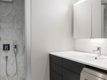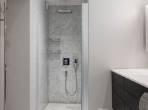 - Pesutilojen kuvaus: Kylpyhuoneessa on marmorikuvioitu laattalattia lattialämmityksellä. Seinät on maalattu ja osittain laatoitettu. Erillisessä suihkunurkkauksessa on sadesuihku ja lasiseinä.