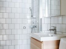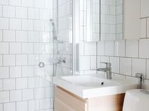 - Kylpyhuone, sadesuihku, suihkuseinä, peilikaappi, allaskaappi, wc-istuin