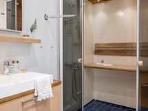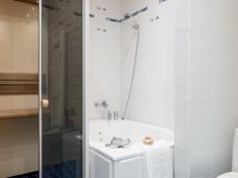 Lattia laattaa ja seinät laattaa. Suihku, suihkuseinä, poreamme, höyrysauna, sauna. Wc-istuin, allaskaappi, allashana, allas ja peilikaappi. Lattialämmitys.