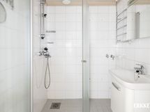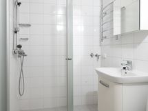 - Pesutilojen varusteet: WC-istuin, suihku, suihkuseinä, pesukoneliitäntä, peilikaappi, pesuallas, allaskaappi, bidee-suihku ja vesikiertoinen kuivauspatteri. Pesutilojen kuvaus: Toimiva vaaleasävyinen kylpyhuone.