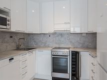 - Työtason materiaali: Laminaatti. Remotoitu vuonna 2009 ja sitä on päivitetty vuonna 2021. Kaapistot, jääkaappi/pakastin, induktioliesi, viinikaappi, liesituuletin, astianpesukone (45 cm), liesituuletin. Välitila: Levy. (levyn alla vanha laatta).