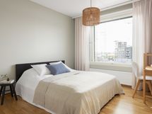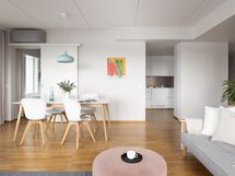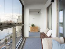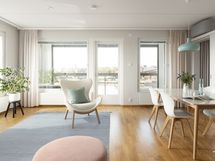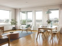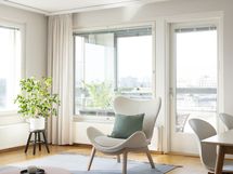 Tässä päälle sadan neliön asunnossa on neljä makuuhuonetta, asustelet korkealla viidennessä kerroksessa, ikkunoita on kahteen ilmansuuntaan ja selkeä tila yhdistää oleskelun, ruokailun ja kokkailun asunnon keskiöön. Happea pääset haukkaamaan omalla isolla lasitetulla parvekkeella, joka on lämpimään vuodenaikaan kuin yksi huone lisää tai olohuoneen jatke.