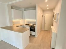 Keittiössä jääkaappi-pakastin, induktioliesi, erillisuuni integroidulla mikroaaltouunilla, liesituuletin, kalusteisiin integroitu astianpesukone sekä työtason LED-valot. Himmennettävät LED-spotvalot lasketussa katossa.