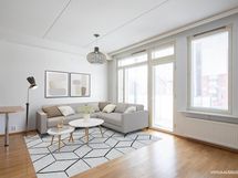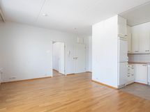 Asunnossa on toimiva ja selkeä pohjaratkaisu, jossa olohuone ja keittiö muodostavat yhtenäisen oleskelutilan. Keittiö sijoittuu seinustalle ja avautuu luontevasti olohuoneen yhteyteen. Olohuoneesta on kulku parvekkeelle, joka tuo lisää käytettävää tilaa. Parvekkeelta on näkymä rauhalliselle sisäpihalle.
