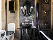 Sadesuihku, Singerin vintage ompelupöydästä räätälöity käsienpesupöytä, johon asennettu kivinen malja-allas, peili ja sen molemmilla puolella olevat valaisimet, ledvalaistus, pesukoneliitäntä, kuumaan käyttöveteen liitetty ns. rättipatteri ja lattialämmitys.