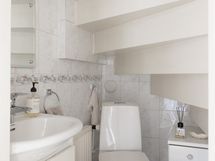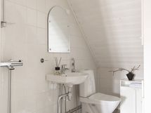 - Pesutilojen kuvaus: Yläkerrassa osittain viiston katon alla kylpyhuone suihkulla, remontoitu viimeksi 1989 ja kaipaa uudistamista. Tilassa WC-istuin.