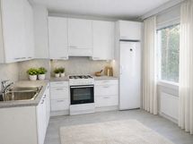 - Paljon kaappitilaa, Suuri tiskipöytä, Halogeenivalot, Laminaattitasot, Astianpesukone, Pesukoneliitos, Kaasuliesi, Liesituuletin, Liesi tai uuni erikseen, Jääkaappi, Pakastin