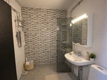 - Suihkuseinä, Suihku, Pesukonevalmius, Peilikaappi, Rättipatteri, Laattalattia, Laattaseinä