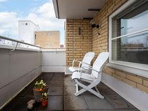 - Terassiparveke, jossa laatoitettu lattia. Osittain katettu. Avarat näkymät puistomaiselle asuinkorttelin pihalle.
