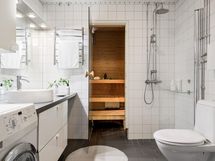 - Sauna, sähkökiuas, kylpyhuone, erillinen wc, suihku, suihkuseinä, peilit, peilikaappi, kaapit, allaskaappi, pesukoneliitäntä, kiinteät valaisimet. Pyyhepatteri