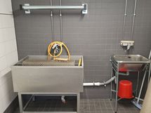 Suihku, Pesutornivalmius, käsisuihku, seinä-wc, lisätty laajennuksen yhteydessä. Lattialämmitys (lämmöntalteenotto ohjattu kph), 2 lattiakaivoa. Pääväri valkoiset laattaseinät, lisäksi kaareva tehosteseinä, harmaa laattalattia.
