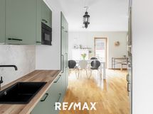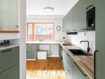 - Kesällä 2025 uusitun keittiön varustuksena on täyskorkeat integroidut jääkaappi ja pakastin, induktioliesitaso, liesituuletin, jolla ohjataan huoneiston ilmanvaihtoa, erillisuuni, integroitu mikro sekä astianpesukone. Keittiön lattia on parkettia, seinät on maalattu. Keittiön työtaso on laminaattia ja keittiön välitila Fibon märkä- ja välitilalevyä.