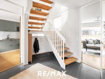 - Pesutilojen kuvaus: Alakerran kylpyhuoneessa on wc-istuin, bidee-suihku, pesuallas, allaskaappi, peilikaappi sekä suihku. Lattia on laatoitettu, seinät kaakelia. Yläkerran kylpyhuoneessa on wc-istuin, bidee-suihku, pesuallas, allaskaappi, peilikaappi, suihku sekä pesukoneliitäntä. Lattia on laatoitettu, seinät kaakelia. Yläkerran kylpyhuoneen yhteydessä on sauna. Molemmissa kylpyhuoneissa sekä saunassa on ikkuna ja sähkökäyttöinen mukavuuslattialämmitys.