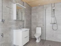 - Suihku/ kääntyvä suihkuseinä, peilikaappi kahdella ovella, pyykkikaappi, pesukoneliitäntä, lattialämmitys