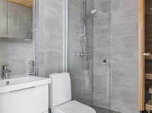 Kahden makuuhuoneen yhteydestä löytyy erillinen wc kodinhoitopisteineen, sekä kylpyhuone, jonka yhteydestä löytyy oma sauna! Tämä on harvinaisuus talossa. Keittiö on olohuoneen yhteydessä omassa syvennyksessään ja on erittäin hyvin varusteltu. Täältä löytyy mm. täyskorkeat jääkaappi ja pakastin. Olohuoneesta on käynti lasitetulle parvekkeelle. Parveke katsoo meren suuntaan.