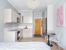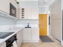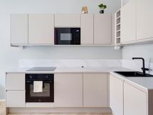 - Jääkaappi pakastelokerolla, kiertoilmauuni, mikroaaltouuni, astianpesukone, induktioliesi, liesikupu/-tuuletin, pyykinpesukone, kaapistot. Työtaso laminaattia.