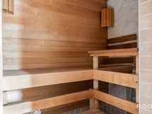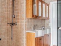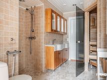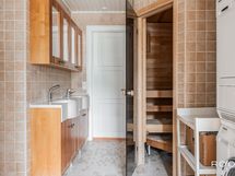 Kylpyhuone ja sauna ovat tilava kokonaisuus. Taloyhtiön LVIS-remontin yhteydessä kylpyhuone on tarkoitus remontoida, jolloin siitä saa suunniteltua oman näköisensä.