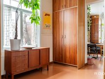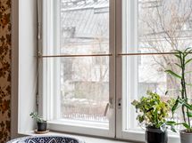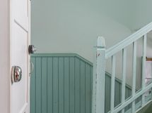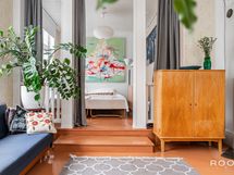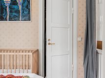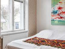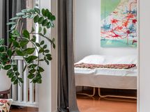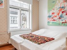 Makuuhuoneeseen menee pienet askelmat ja tilaan mahtuu loistavasti parisänky. Koko asunnossa on lämmin ja yhtenäinen tunnelma, jossa vanhan puutalon henki, lautalattiat ja yksityiskohdat luovat kodille oman, tunnistettavan ilmeen.