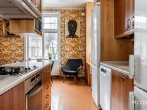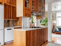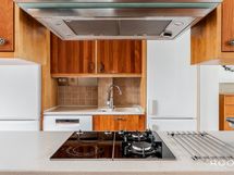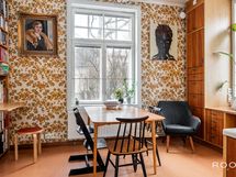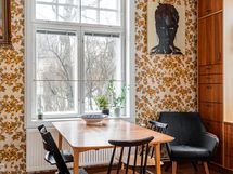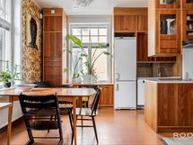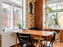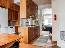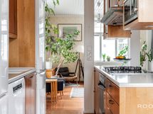 Keittiö ja ruokailutila muodostavat toimivan ja kodikkaan kokonaisuuden. Keittiössä on runsaasti kaappi- ja työskentelytilaa, ja sen keskelle sijoittuva saareke tekee tilasta käytännöllisen niin arjen askareisiin kuin seurusteluun. Ruokailutila asettuu kauniisti ikkunoiden äärelle - paikka, jossa arkihetket ja viikonlopun brunssit saavat oman rauhallisen rytminsä.