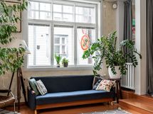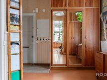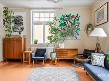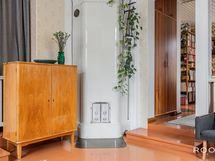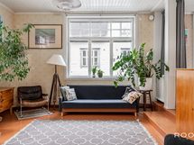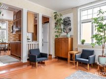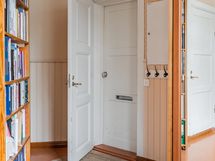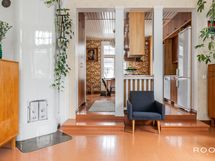 Sisään astuessa vastassa on selkeä eteinen, josta kulku avautuu kodin sydämeen. Olohuone on avara ja rauhallinen tila, jossa suuret, vanhan talon henkeä huokuvat ikkunat päästävät valon kauniisti sisään. Tilassa on luonteva paikka niin oleskelulle kuin yhdessäololle, ja sen yhteydessä oleva pieni tasoero tuo tilaan persoonallista rytmiä.