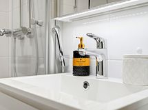 - Allas- ja peiliikaappi, seinä-wc, pyyhekuivain, bidee-suihku, suihku, taittuvat suihkuseinät ja pesukoneliitäntä. Tilassa mukavuus lattialämmitys (sähkö