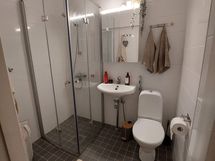 - Varusteet: WC, suihku, suihkukaappi, kiinteät valaisimet, pesukoneliitäntä, allaskaappi, peilikaappi. Tilava KPH. Helppokäyttöinen ja käytännöllinen suihkukaappi.