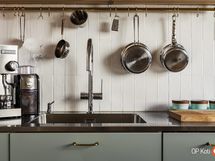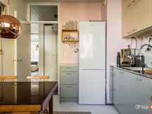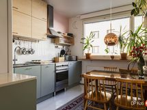 - Jääkaappipakastin (hyvä), induktioliesi, liesituuletin, astianpesukone, kiinteät valaisimet.