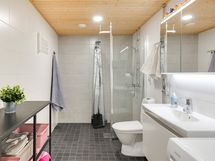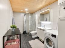 Suihku, Pesukoneliitäntä, Mukavuuslattialämmitys, Tilaa pesukoneelle, Käsisuihku, Kaapisto, Allas, Suihkuseinä, WC-istuin, Peilikaappi