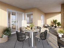 - sisään vedetty, lasitettu, iso kulmaparveke lasikaiteella. Parvekkeen suunta: länsi, etelä