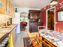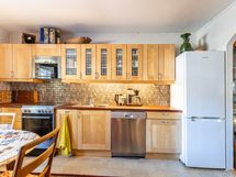 - Jääkaappi/pakastin, uuni, mikroaaltouuni, astianpesukone, keraaminen liesi, liesituuletin hormiin. Lattia: Muovi. Seinät: Maalattu