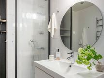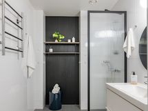 - Pesutilojen varusteet: WC-istuin, suihku, kylpyamme, suihkuseinä, lattialämmitys, peili, pesuallas ja allaskaappi. Pesutilojen kuvaus: Asunnossa on kaksi pesutilaa. Toinen on yläkerrassa ja toinen alakerrassa. Yläkerran kylpyhuoneen varustus on: suihku, suihkuseinä, pesuallas, wc-istuin, pyyhekuivain, peili ja allaskaappi.