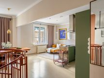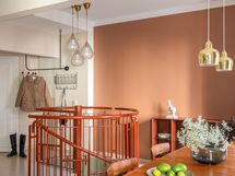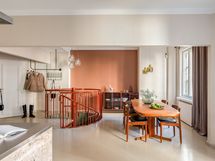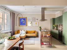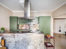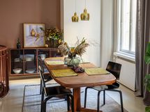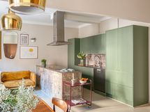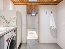 - Keittiön varusteet: Jääkaappipakastin (Rosteri), liesi, liesituuletin (hormiin, huippuimuri), uuni (höyryuuni), keittiösaareke, astianpesukone (Rosteri) ja kaapistot (ISKU). Liesi: Induktioliesi. Työtason materiaali: ruostumatonta terästä.