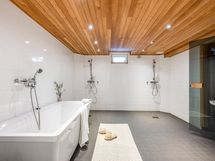 Alakerran pesuhuoneessa on kylpy, ja kaksi suihkua. Pesuhuoneesta on käynti saunaan. Erillisen WC:n varusteet: WC-istuin, pesuallas ja peili. Erillisen WC:n kuvaus: Erillinen wc sijaitsee kodinhoitohuoneen ja alakerran pesuhuoneen yhteydessä.