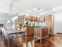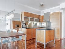 - Keraaminen liesitaso, erillinen kiertoilmauuni, mikroaaltouuni, liesituuletin hormiin (Kartano), astianpesukoneliitäntä, astianpesukone, pyykinpesukoneen liitäntä, pyykinpesukone, jääkaappi/pakastin. Kaapistot, irrallinen saareke, kivitasot.