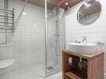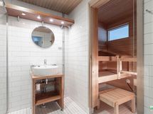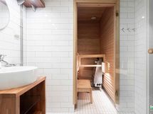 - Kylpyhuone: Suihku/suihkuseinä, peilit, lattialämmitys, kiinteät valaisimet, pyyhekuivain. Sähkösauna.