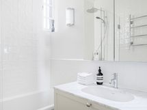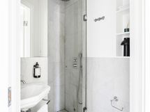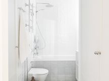 Kph 2: Puusepän integroidut kaapistot, seinä wc, Itämeren marmoria pinnat, integroitu kattosuihku, integroitu Unidrain vedenpoisto suihkussa.