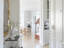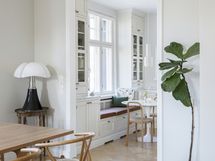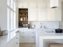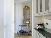 B&O kaiuttimet integroitu, aamiaskaappi, Gaggenau 70cm induktioliesi, Mielen kahvaton uuni, Liebherr jääkaappi-pakastin yhdistelmä x 2. Viinikaappi Festivo 45cm x 190cm, integroitu Mielen tiskikone,
