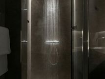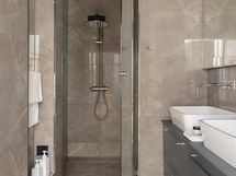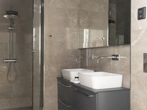 - Pesutilojen kuvaus: Kylpyhuoneessa sadesuihku, suihkuseinä, peili, allaskaapisto, 2 allasta, wc-istuin ja lattialämmitys. Katossa himmennettävät spottivalot ja led-valonauhat. Seinät ja lattia italialaista porcellanato-laattaa. .