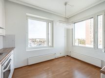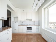 - Keittiön varusteet: Jääkaappipakastin, liesituuletin, uuni ja liesi. Työtason materiaali: Laminaatti. Valoisa keittiö johon mahtuu pieni ruokapöytä laskutilaa on kivasti.