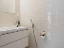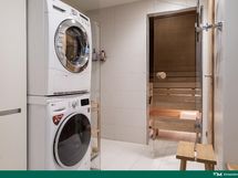 - Kylpyhuone, suihku, peilikaappi, pesukoneliitäntä, lattialämmitys, kylpyhuonekaapisto, kiinteät valaisimet, erillinen wc, sähkösauna, peilit