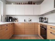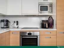- Jääkaappi, pakastin, kiertoilmauuni, erillisuuni- ja taso, astianpesukone, astianpesukoneliitäntä, kaapistot, induktioliesi, liesituuletin hormiin, keittiön tasot akryyliluonnonkiveä (LG Himax)