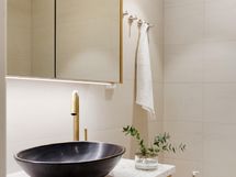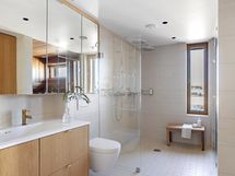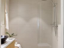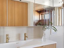 - Kph1 (ikkunallinen): 2x suihku, suihkuseinä, allaskaappi, peilikaapit, seinä-wc, kaapisto, pesukoneliitäntä (kaapistossa), kiinteät valaisimet, lattialämmitys. Sauna (ikkunallinen): sähkökiuas (Tulikivi). Kph2: suihku, sadesuihku, seinä-wc, allaskaappi, peilikaappi, kiinteät valaisimet, lattialämmitys.