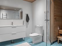 - Pesutilojen varusteet: WC-istuin, pesukoneliitäntä, allaskaappi, suihkuseinä, pesukone, kuivausrumpu, bidee-suihku, suihku ja peili. Pesutilojen kuvaus: Tilava kylpyhuone ja saunaosasto sekä erillinen wc. Erillisten WC:n lukumäärä: 1. Erillisen WC:n varusteet: WC-istuin, pesuallas, bidee-suihku ja allaskaappi.